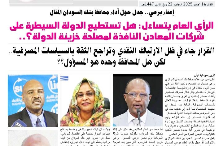متساءلا: هل سينجح محافظ بنك السودان الجديد في السيطرة علي الذهب كمورد قومي؟.. وما هي صلاحياته المرتقبة وعلاقته بوزارة المالية؟.. وهل ستستطيع الدولة السيطرة علي شركات المعادن النافذه لمصلحة خزينة الدولة؟..