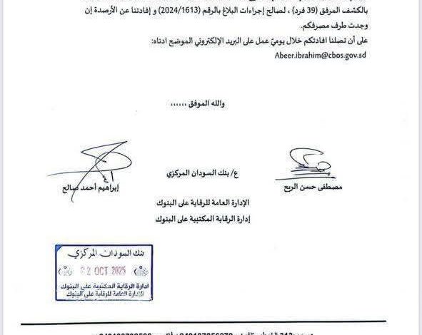 وقال البنك في خطاب معنون إلى المصارف بالإشارة إلى الموضوع أعلاه، وإلى خطاب اللجنة الوطنية للتحقيق في جرائم وانتهاكات القانون الوطني والقانون الدولي الإنساني بتاريخ 2025/10/19، الرجاء حجز وتجميد الحسابات الواردة بالكشف المرفق (39) فردًا، الصالح إجراءات البلاغ بالرقم (2024/1613) و إفادتنا عن الأرصدة إن وجدت طرف مصرفكم على أن تصلنا افادتكم خلال يوم عمل على البريد الإلكتروني.