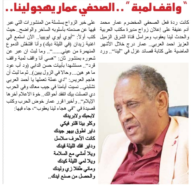 كانت ردة فعل الصحفي المخضرم عمار محمد آدم عنيفة على إعلان زواج مديرة مكتب العربية والحدث لينا يعقوب ومراسل قناة الشرق الزميل العزيز أحمد العربي.. عمار درج خلال الأشهر الماضية على كتابة قصائد غزل في “لينا”.. ورد على خبر الزواج بسلسلة من المنشورات التي عبر فيها عن صدمته بخبر إعلان زواجها بأسلوبه الساخر والواضح.. حيث كتب أولأ: “أيوي أيوي ايويييا.. الآن استمع الي اغنية زيدان (في الليلة ديك) وأنا اقشقش الدموع المنهمرة من عيني……”.. وما لبث ان عبر عن شعوره بمنشور ثان: “هسي أنا واقف لمبة واقف قرد”.. مستشهدا بأبيات حسن الدابي (ود أب عود ما هو هين… وحالا في الزول يبين).. ثم ما لبث أن هاجم العريس: “دي عملة تعملها يا أحمد العربي تشلبني.. نسيت أيامنا في جيب معاك وفي الحرب دي اتصلت بيك اتفقد أحوالك.. خوة الاعلام آخرها الإيلام”.. وأخيرا قرر عمار خوض الحرب وكتب قصيدة في “في هجاء لينا يعقوب”، جاء فيها: